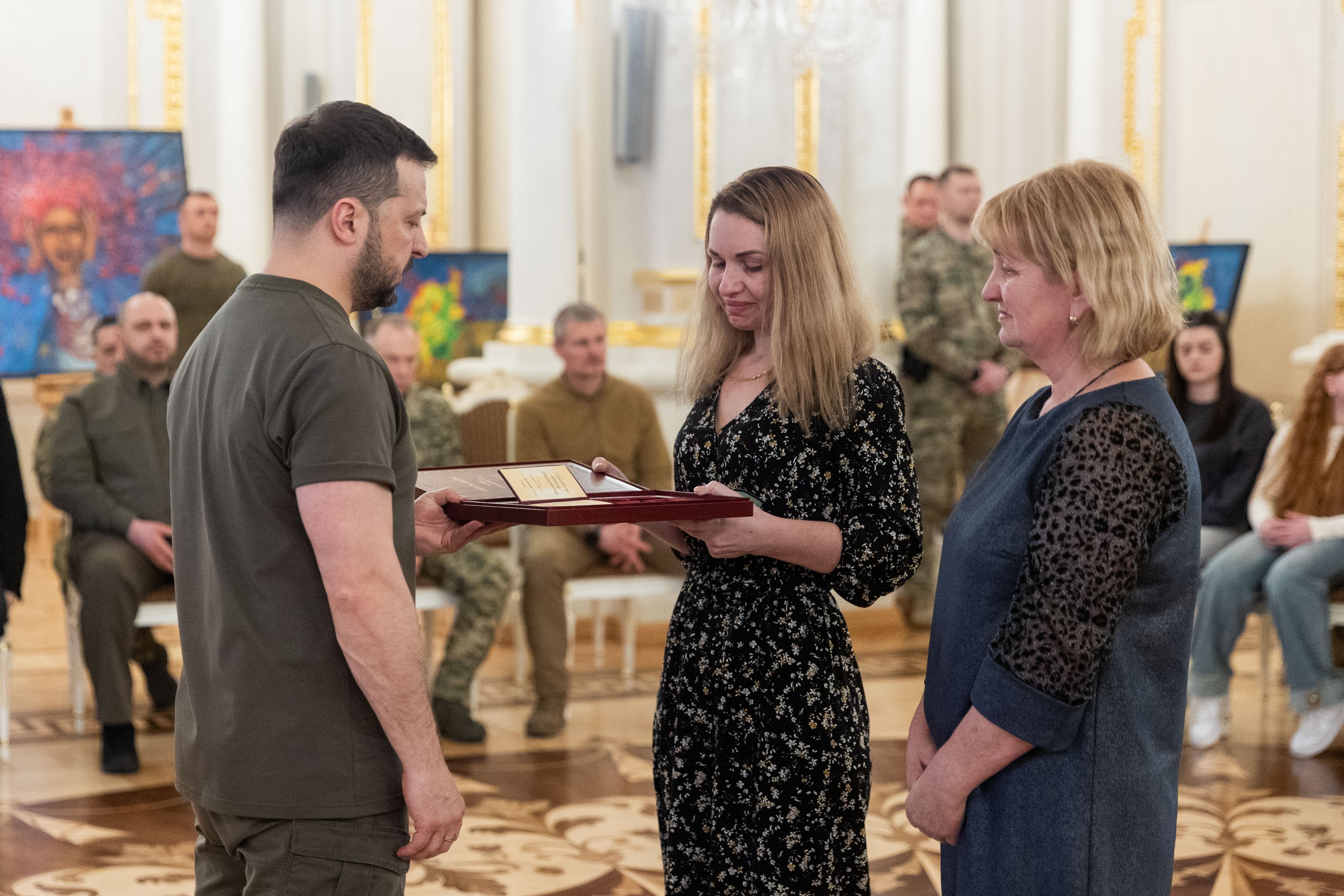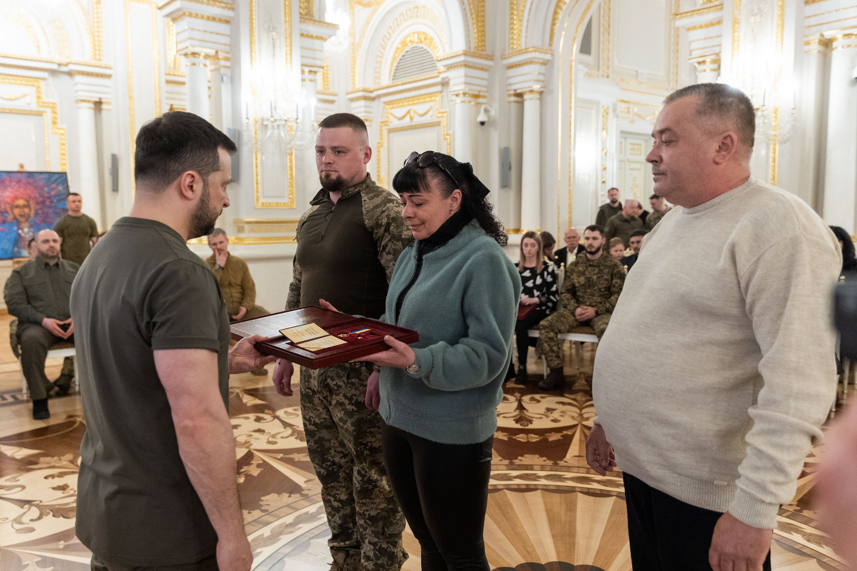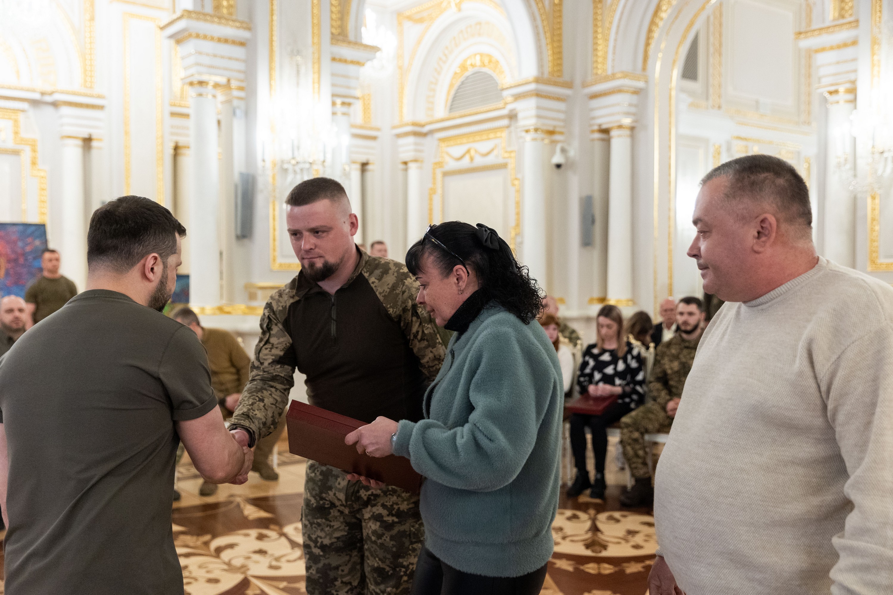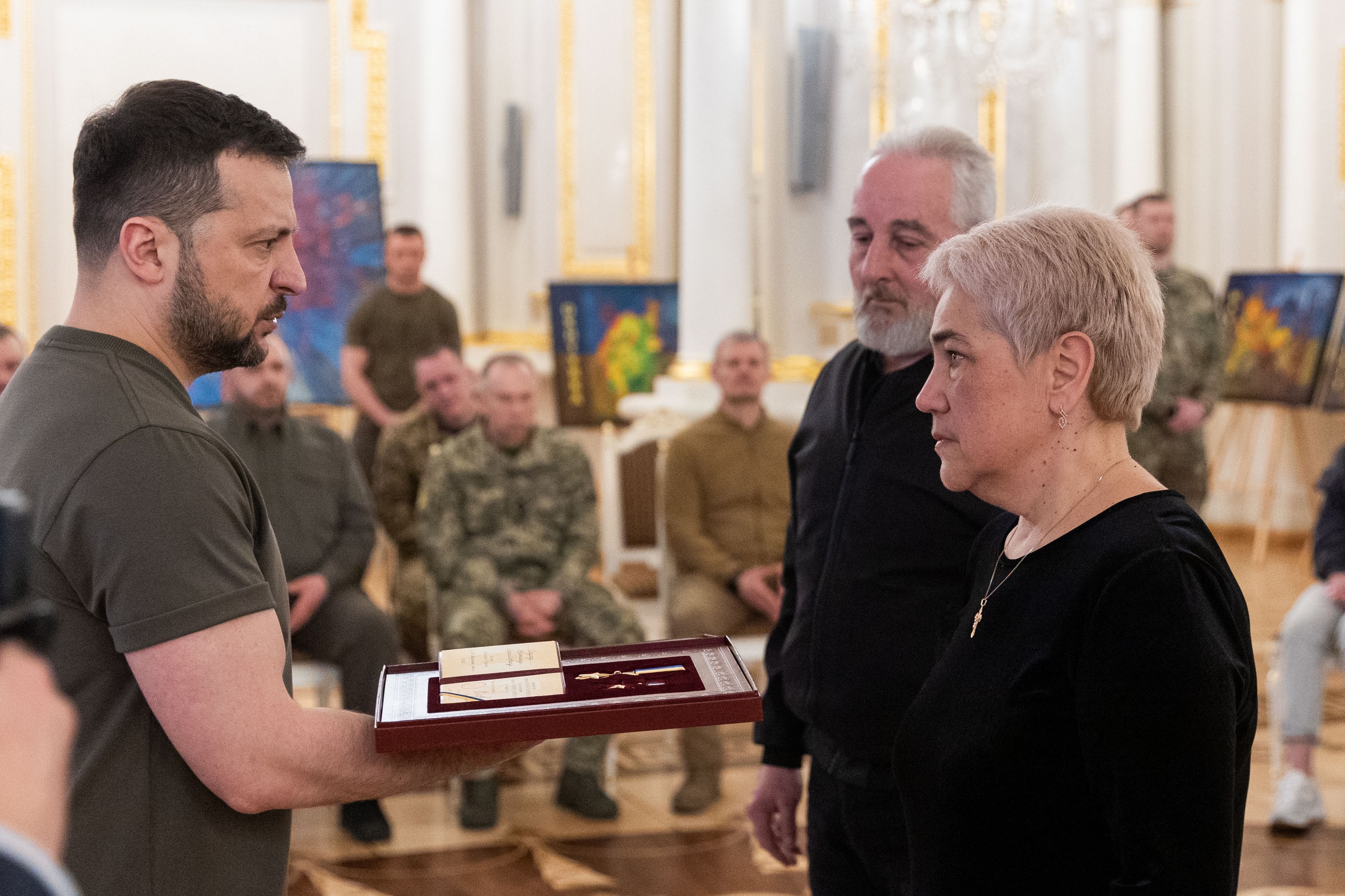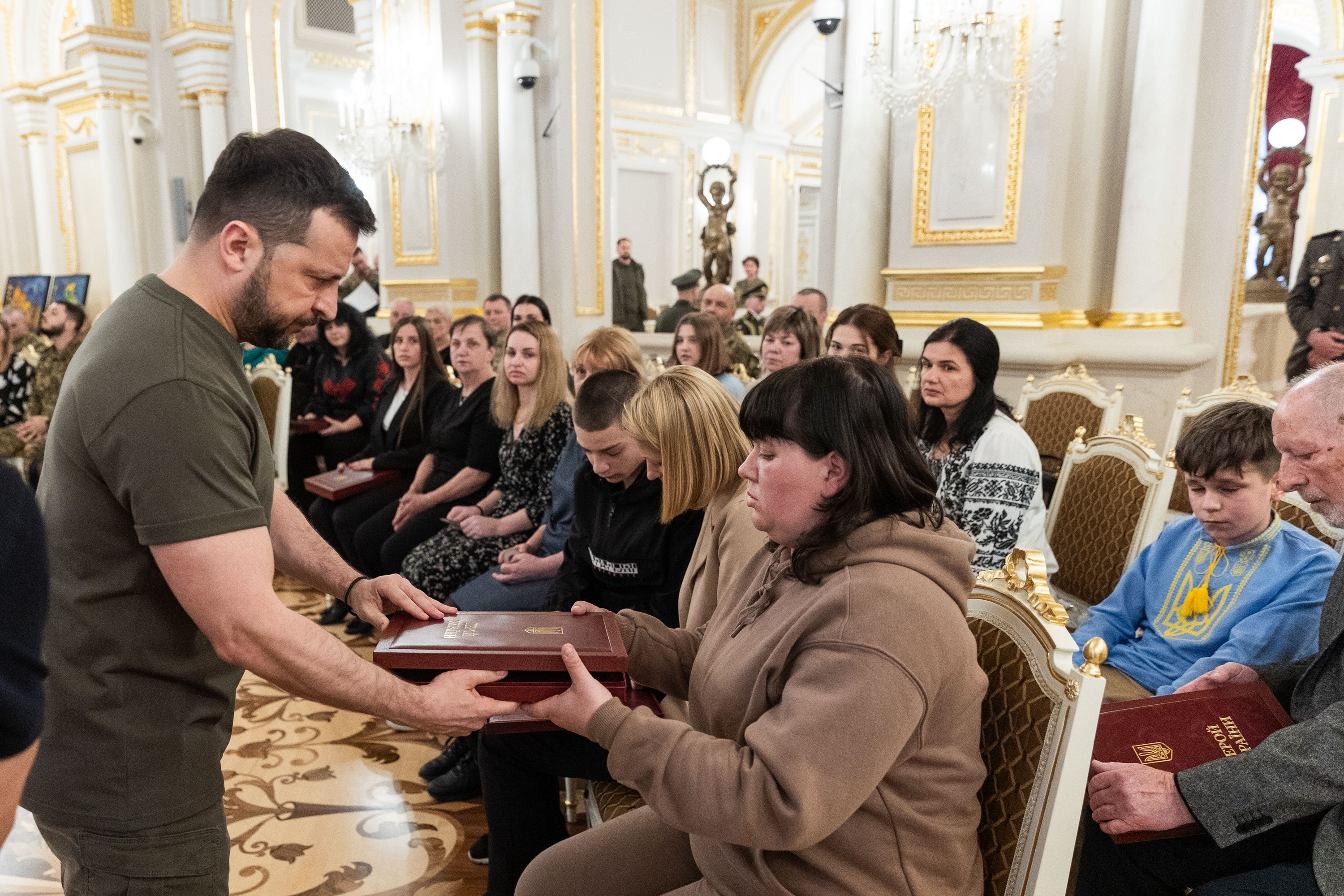 Президент України Володимир Зеленський вручив ордени «Золота Зірка» захисникам, яким присвоєно звання Героя України, та родинам загиблих воїнів, які удостоєні цього звання посмертно.