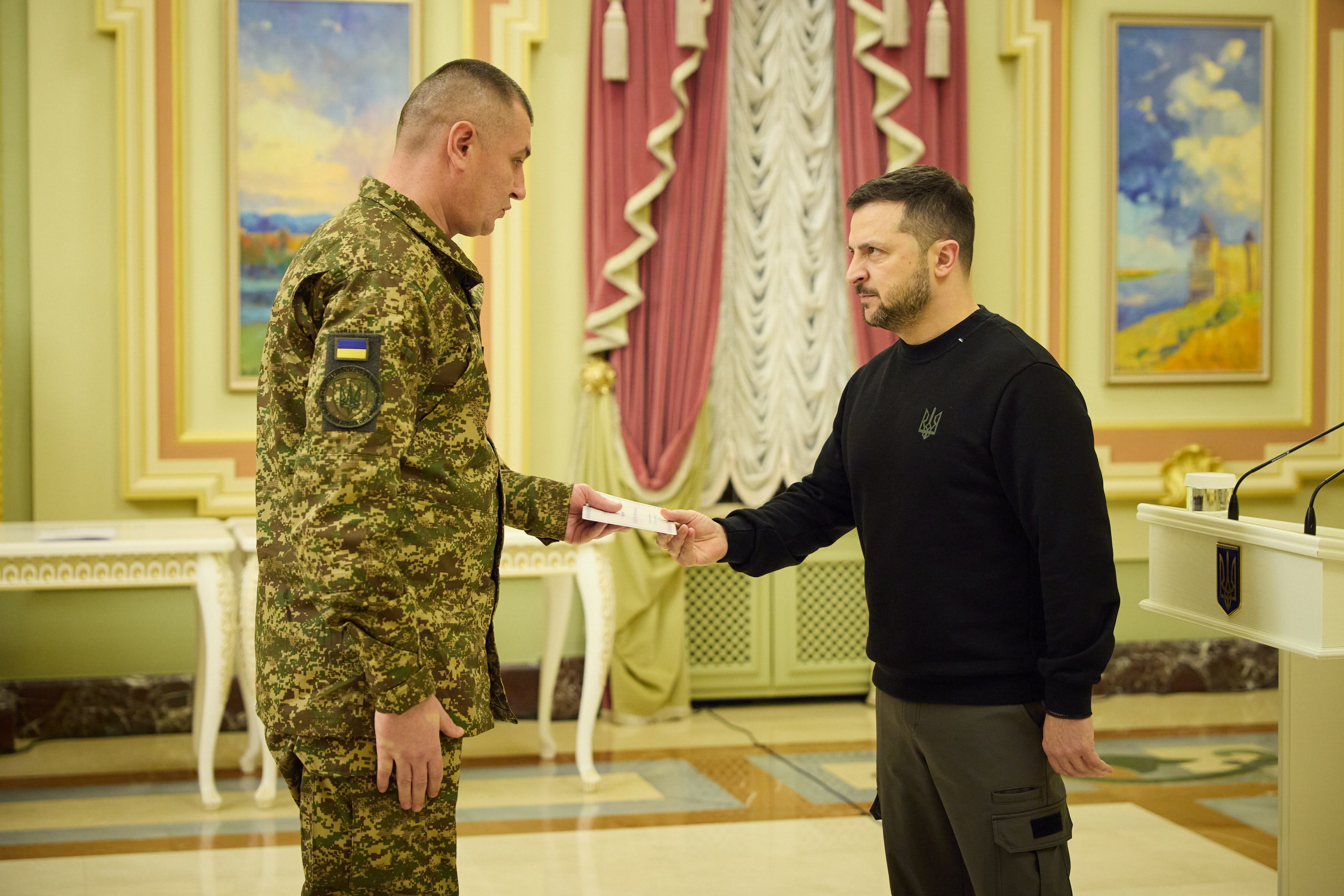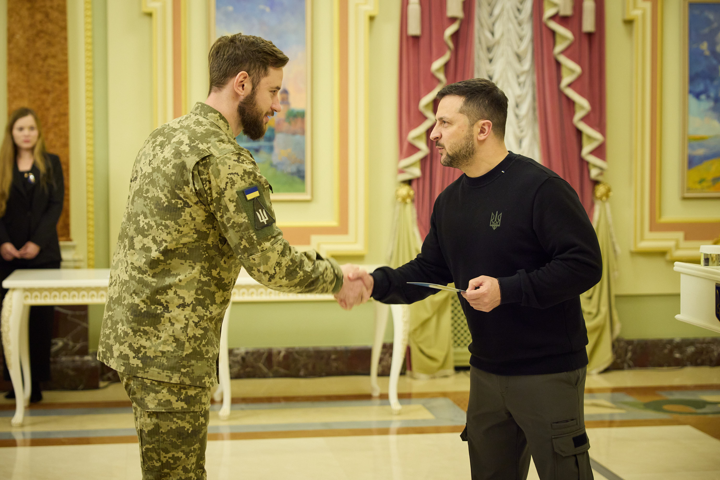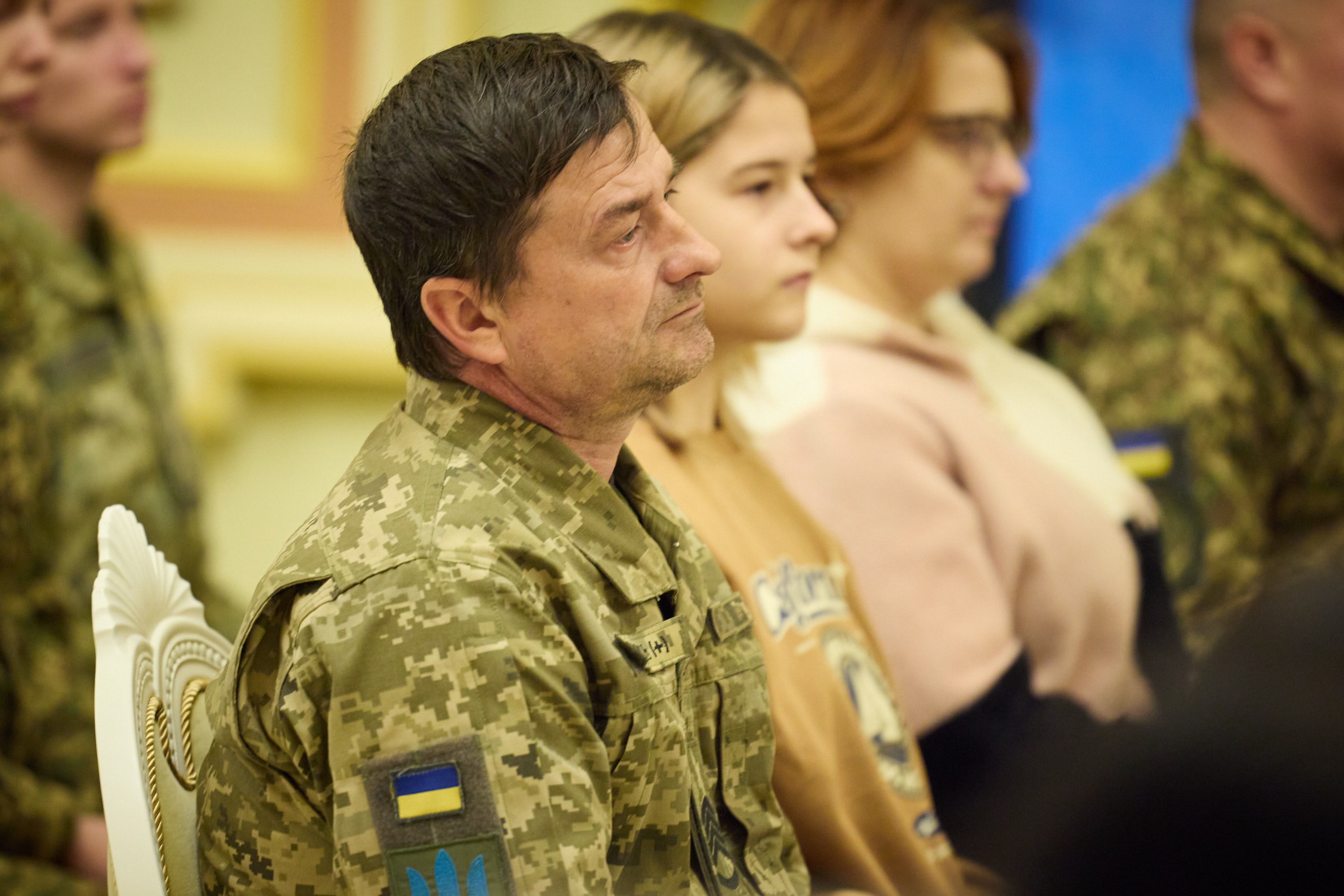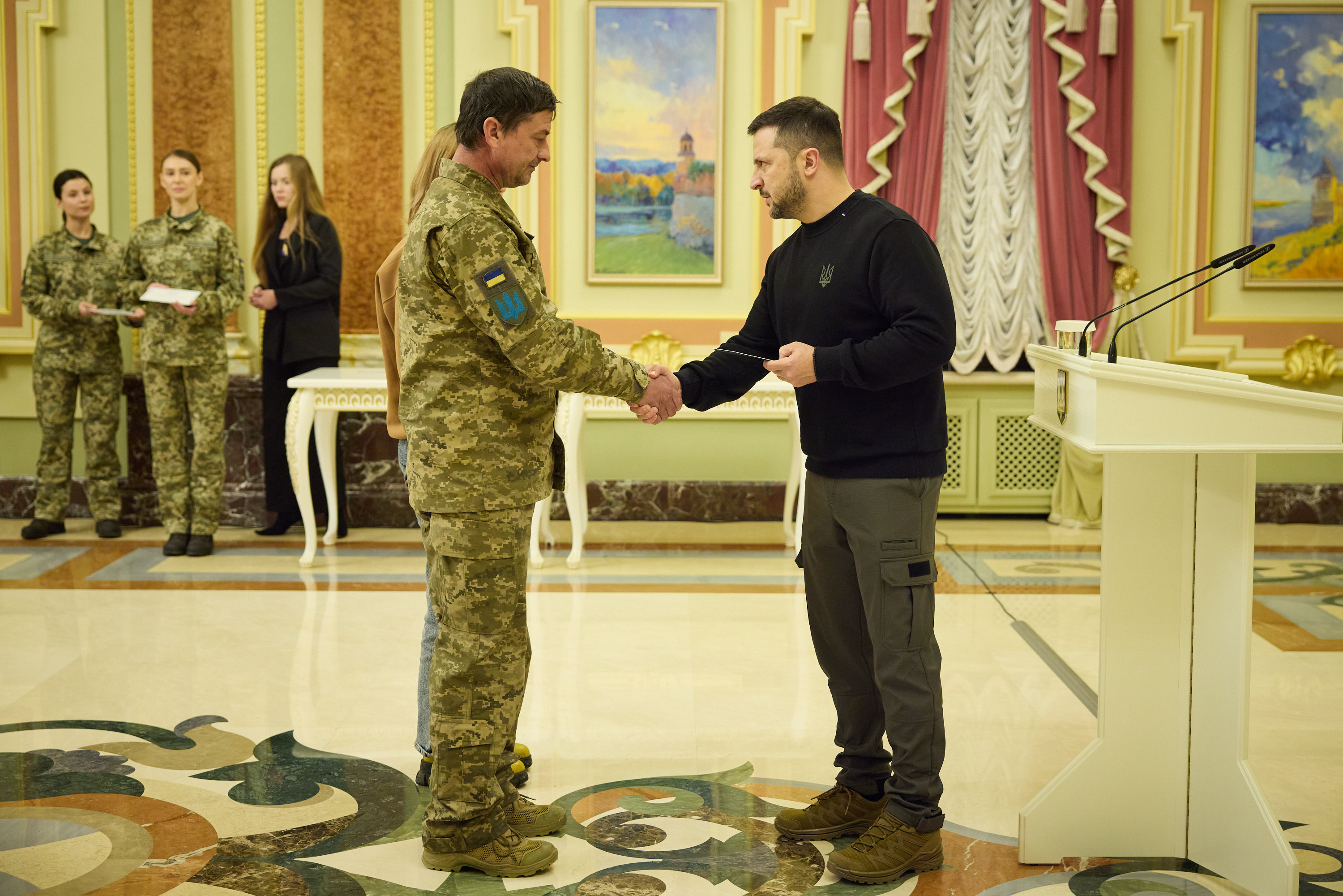 Володимир Зеленський вручив сертифікати на квартири також заступнику командира батальйону морської піхоти майору Сергію Дудіну, який неодноразово проявив себе в боях на Херсонщині, заступнику командира 299-ї бригади тактичної авіації підполковнику Ростиславу Лазаренку, який від початку повномасштабного вторгнення здійснив понад 360 бойових вильотів і особисто знищив більш як 100 одиниць ворожої техніки.