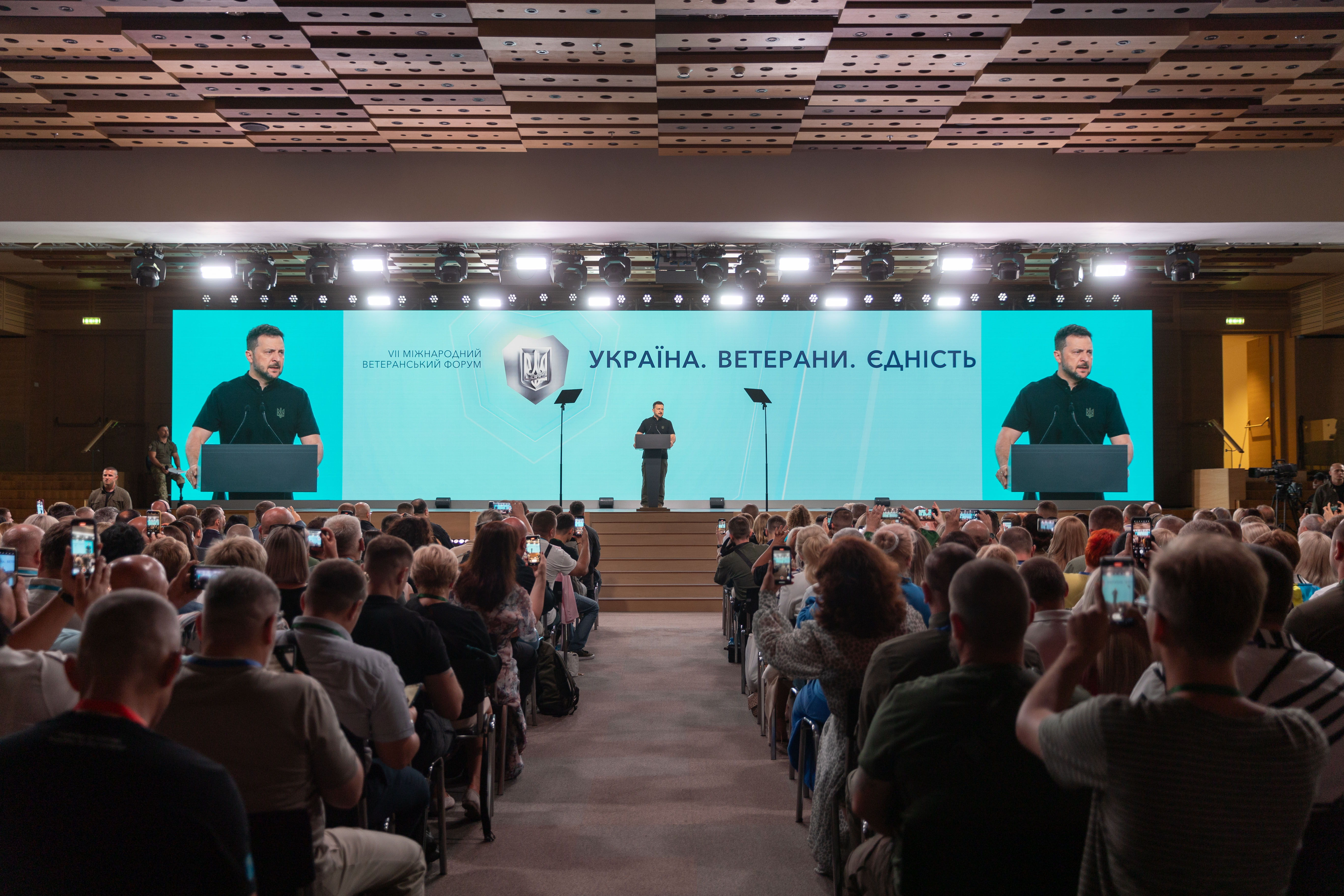 Сьогодні для забезпечення цього своїм указом я доручив уряду затвердити Національну стратегію ветеранської політики та Стратегію формування системи переходу від військової служби до цивільного життя. Це документи, що відображають усі сфери взаємодії держави та ветерана: від початкових кроків у поверненні воїна до цивільного життя до можливостей ветерана зміцнювати життя громади, регіону, держави. Урядовці сьогодні тут – пане Прем’єр-міністре і пане Голово Верховної Ради, всі наші міністри присутні, всі тут, на форумі, мають представити деталі нашої Національної стратегії. І я прошу вас, наших захисників і захисниць, бути справді активними, енергійними, щоб українська ветеранська спільнота зміцнювала подальший розвиток України.