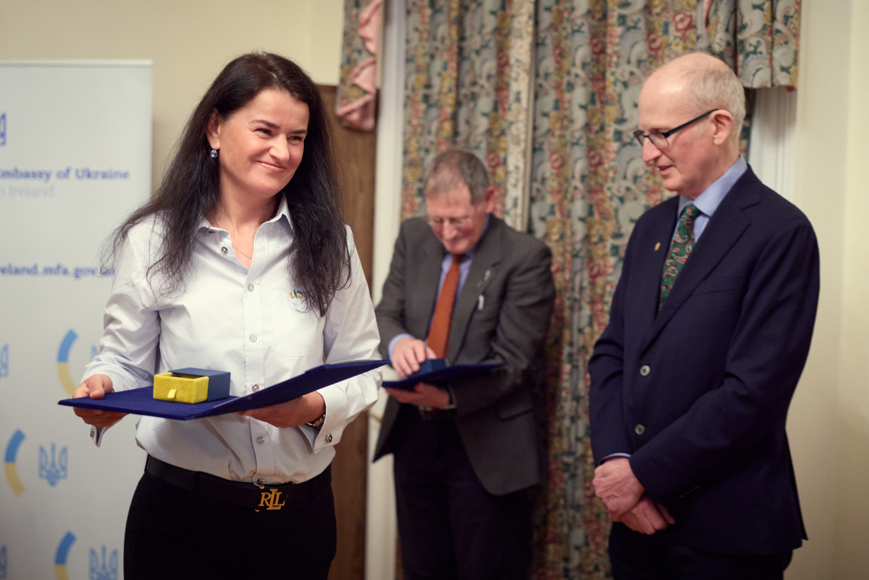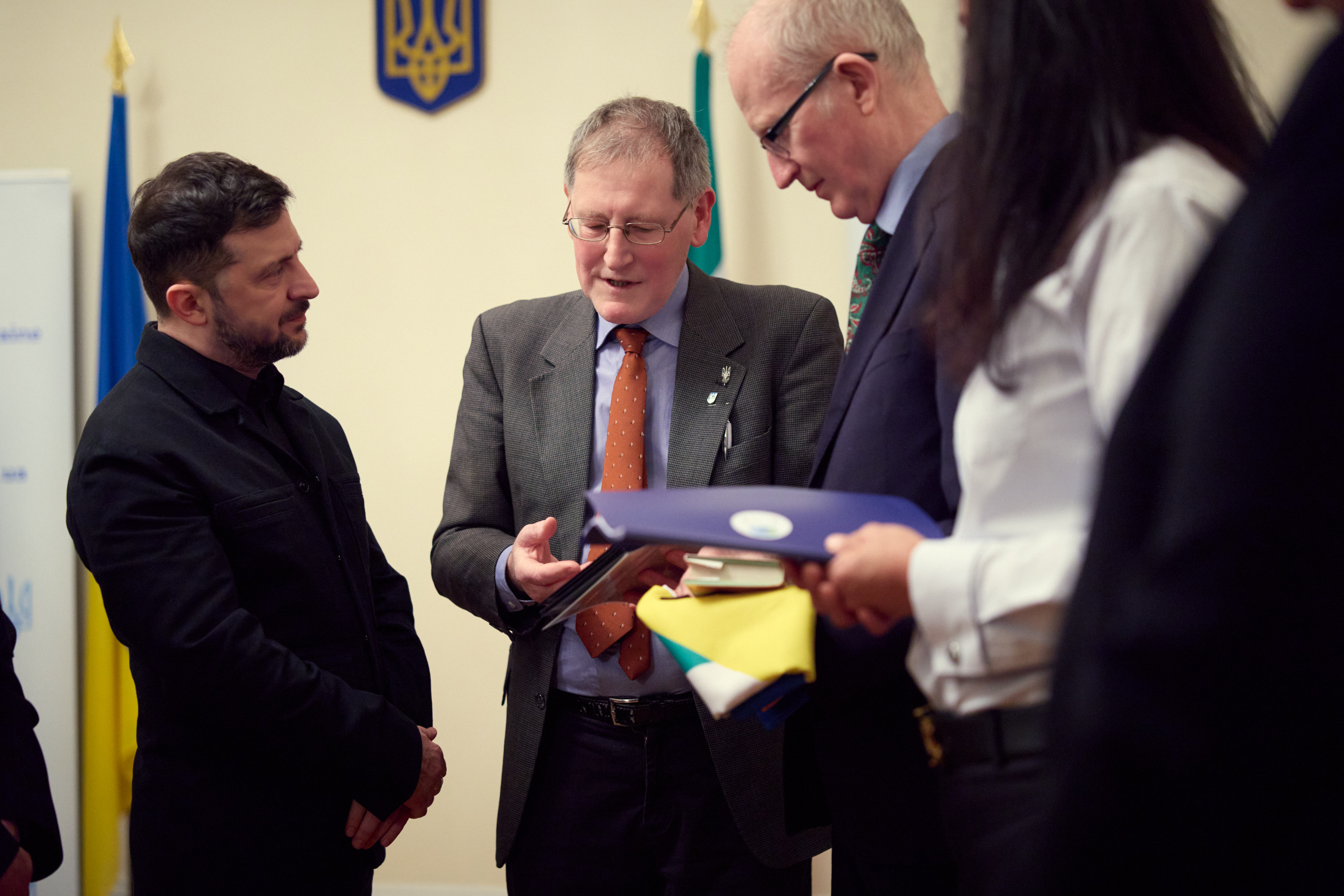 Глава держави вручив відзнаку «Золоте серце» головному досліднику та голові проєкту Ukraine Trauma Джерарду Бері, консультантці-педіатру, неонатологу лікарні Ротонда, доценту кафедри Університетського коледжу Дубліна Людмилі Захарченко та заступнику голови проєкту Ukraine Trauma Крісу Фіцпатріку.