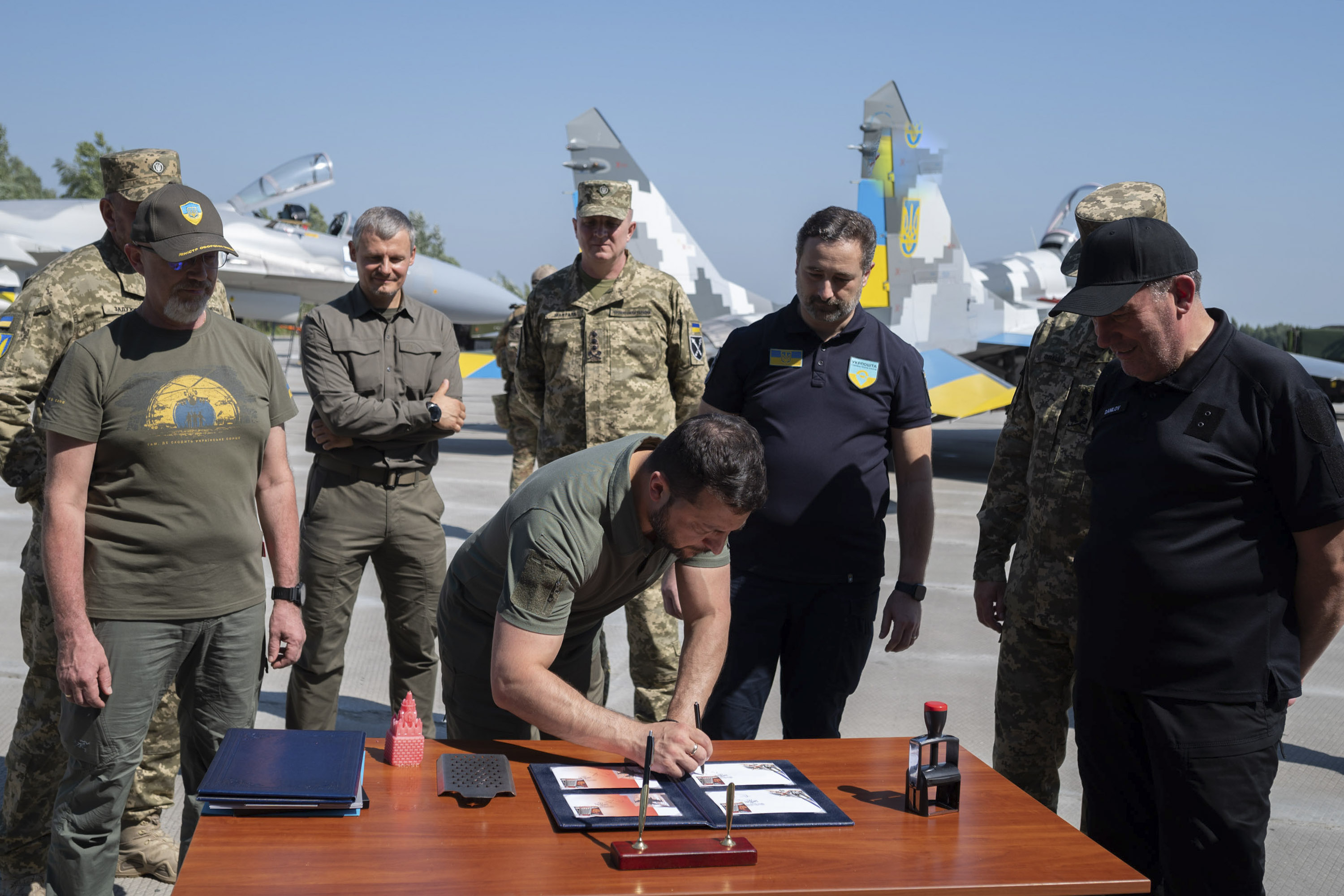 Крім того, Володимир Зеленський, міністр оборони Олексій Резніков, Головнокомандувач ЗСУ Валерій Залужний і командувач Повітряних сил Микола Олещук взяли участь у погашенні поштової марки та конверта «Винищувачі зла», які «Укрпошта» випустила до Дня Повітряних сил.
