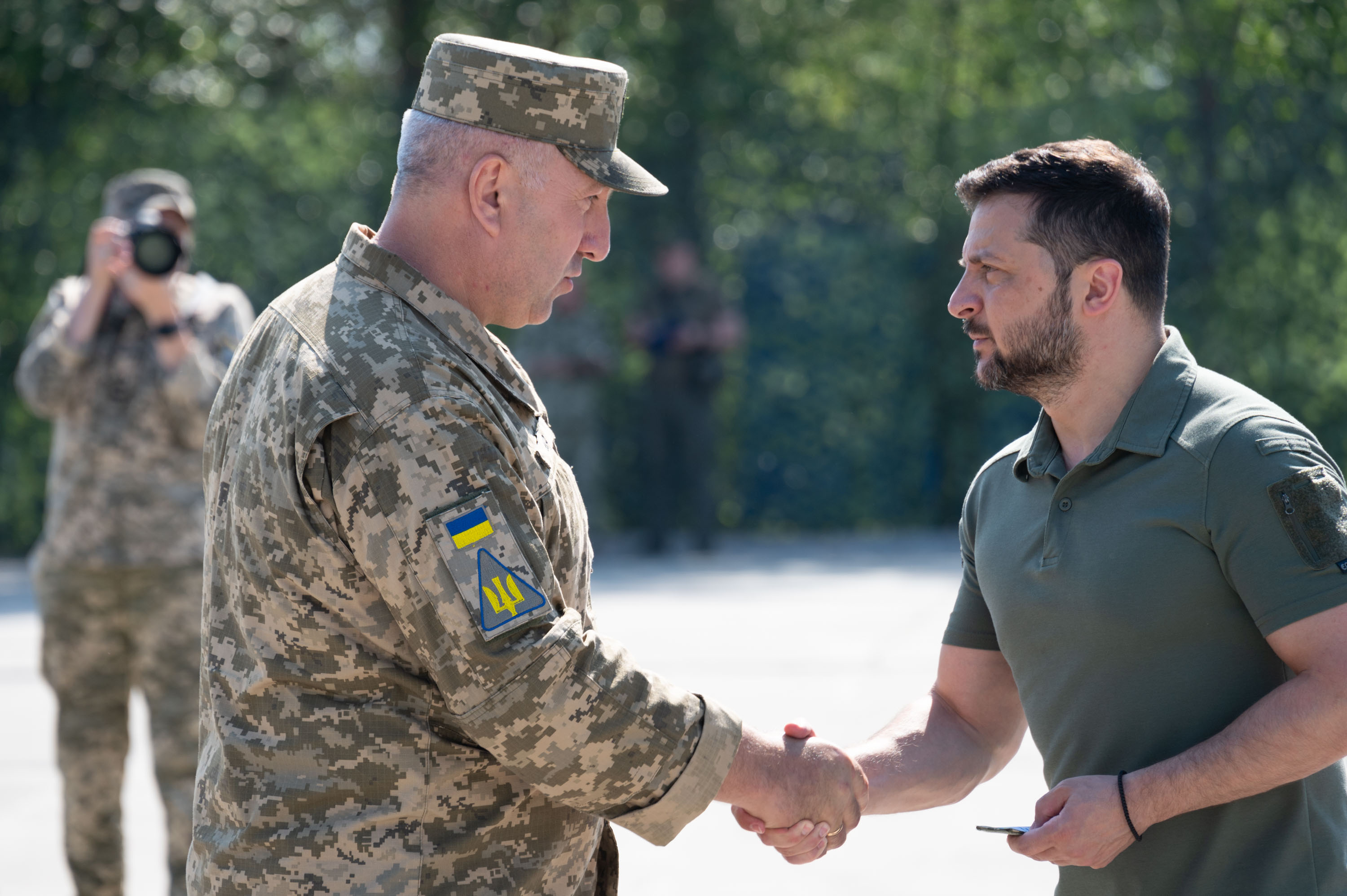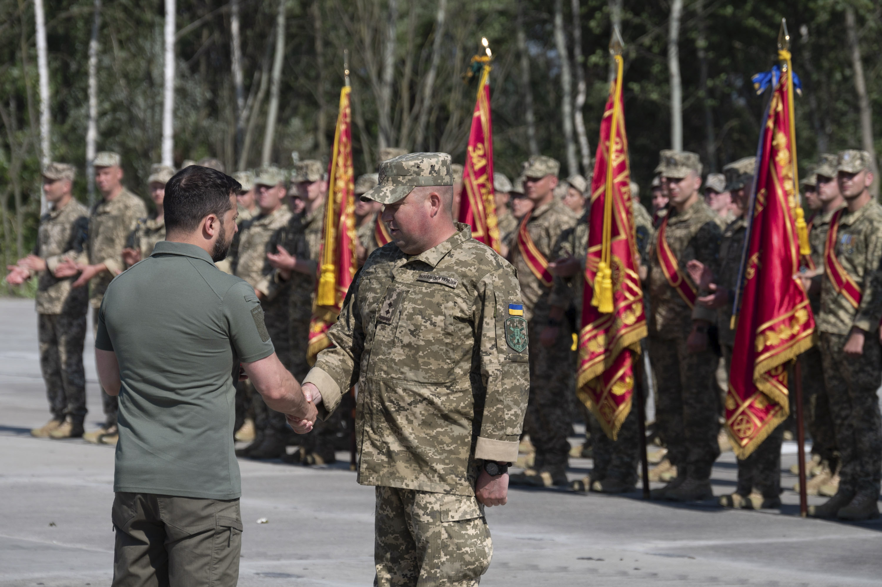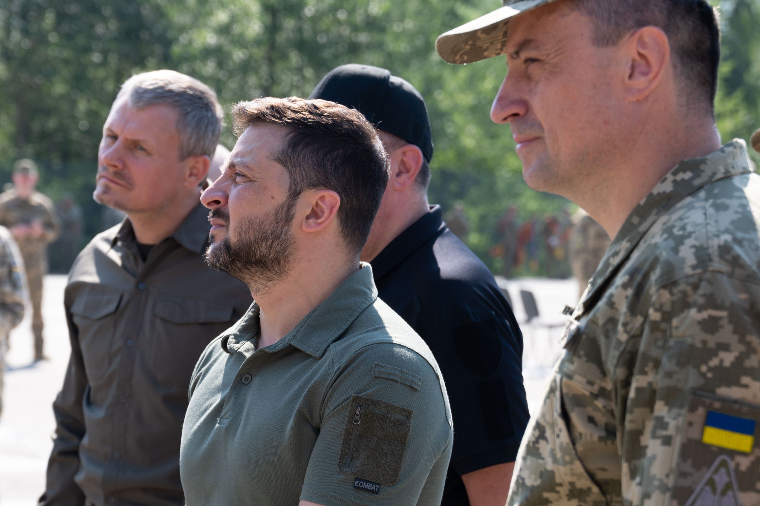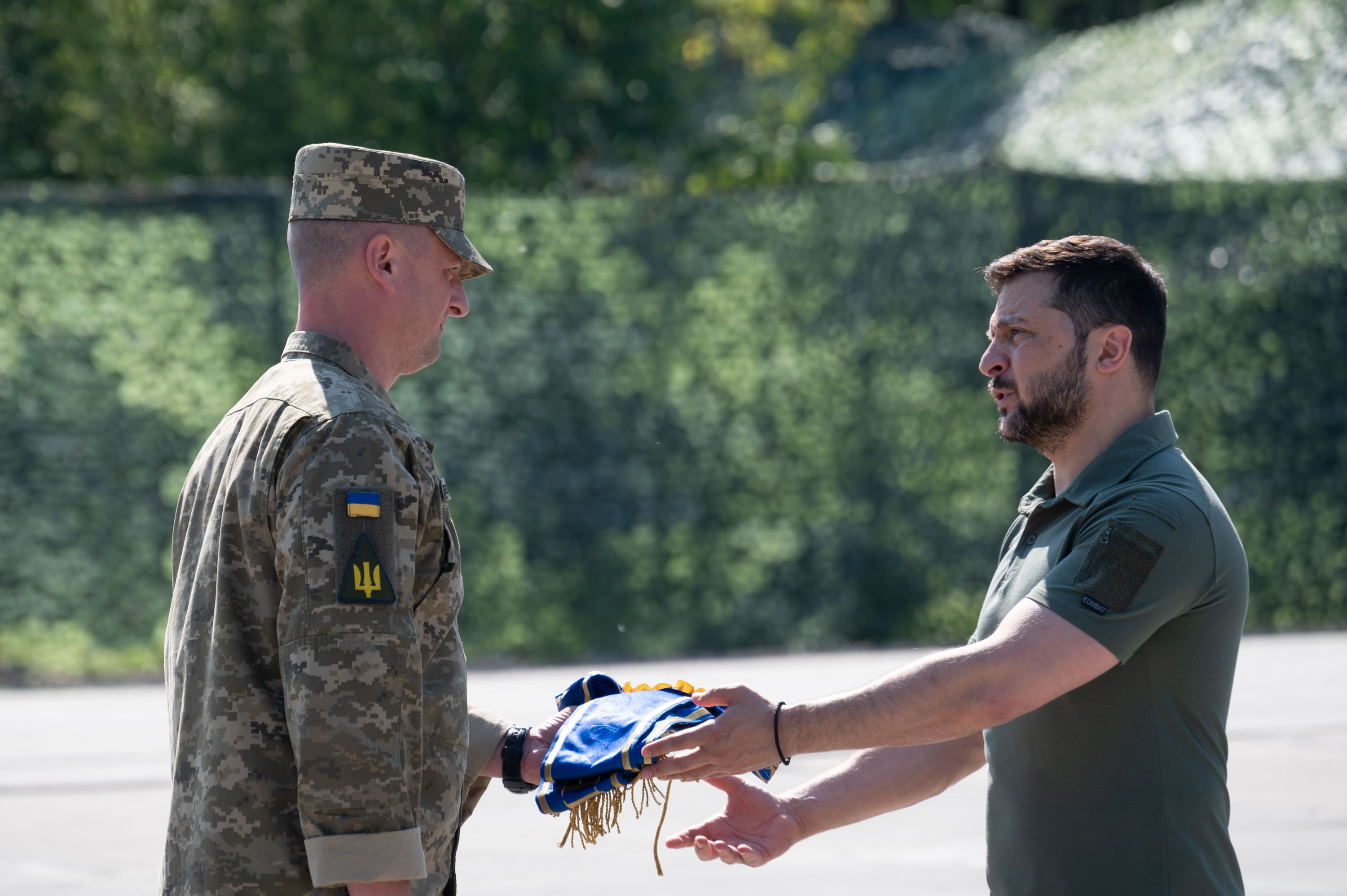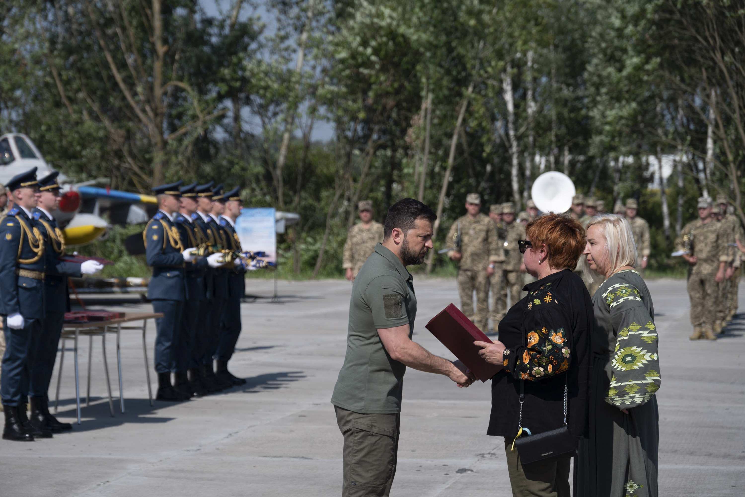 «Дозвольте від льотного складу Повітряних сил Збройних Сил України подарувати вам фактично символ незламності й майбутньої боротьби за нашу неньку Україну. Ви як Президент бороните разом зі Збройними Силами нашу державу. У лицаря є зараз щит – це ППО. Хочемо подарувати вам шолом, бо лицар має бути із шоломом. До повного комплекту лицарю не вистачає меча – авіації, щоб уражати повітряного й наземного противника», – зазначив один із воїнів Повітряних сил і додав, що на цьому шоломі – підписи військових ПС, які отримали звання Героя України, та повних кавалерів орденів «За мужність» і Богдана Хмельницького.