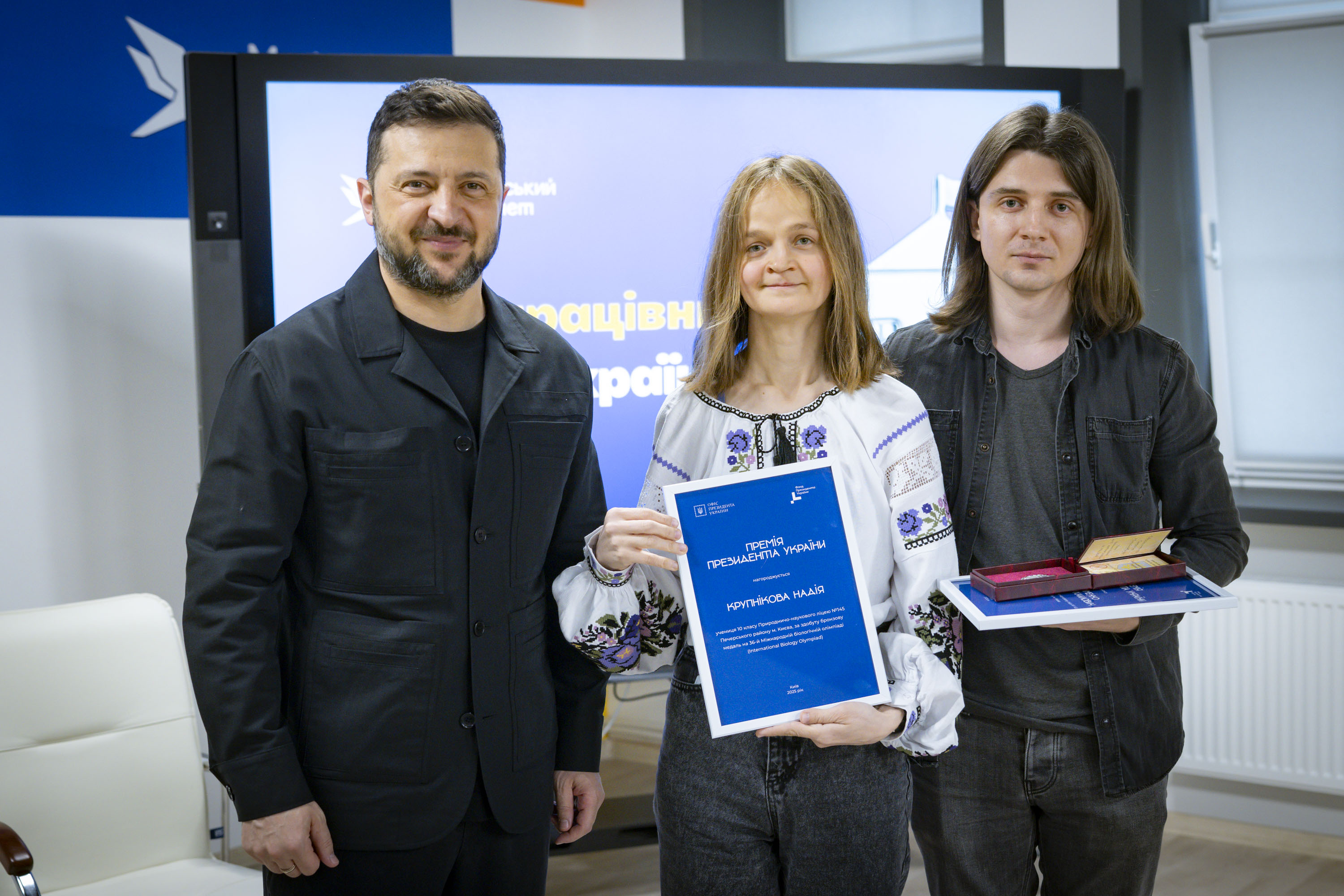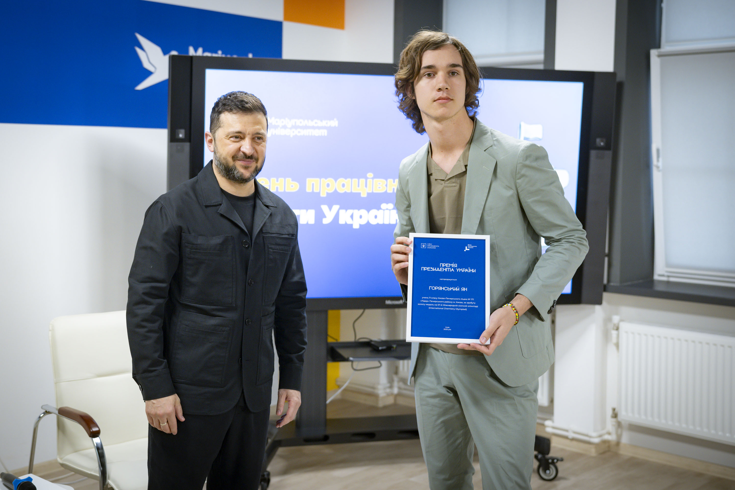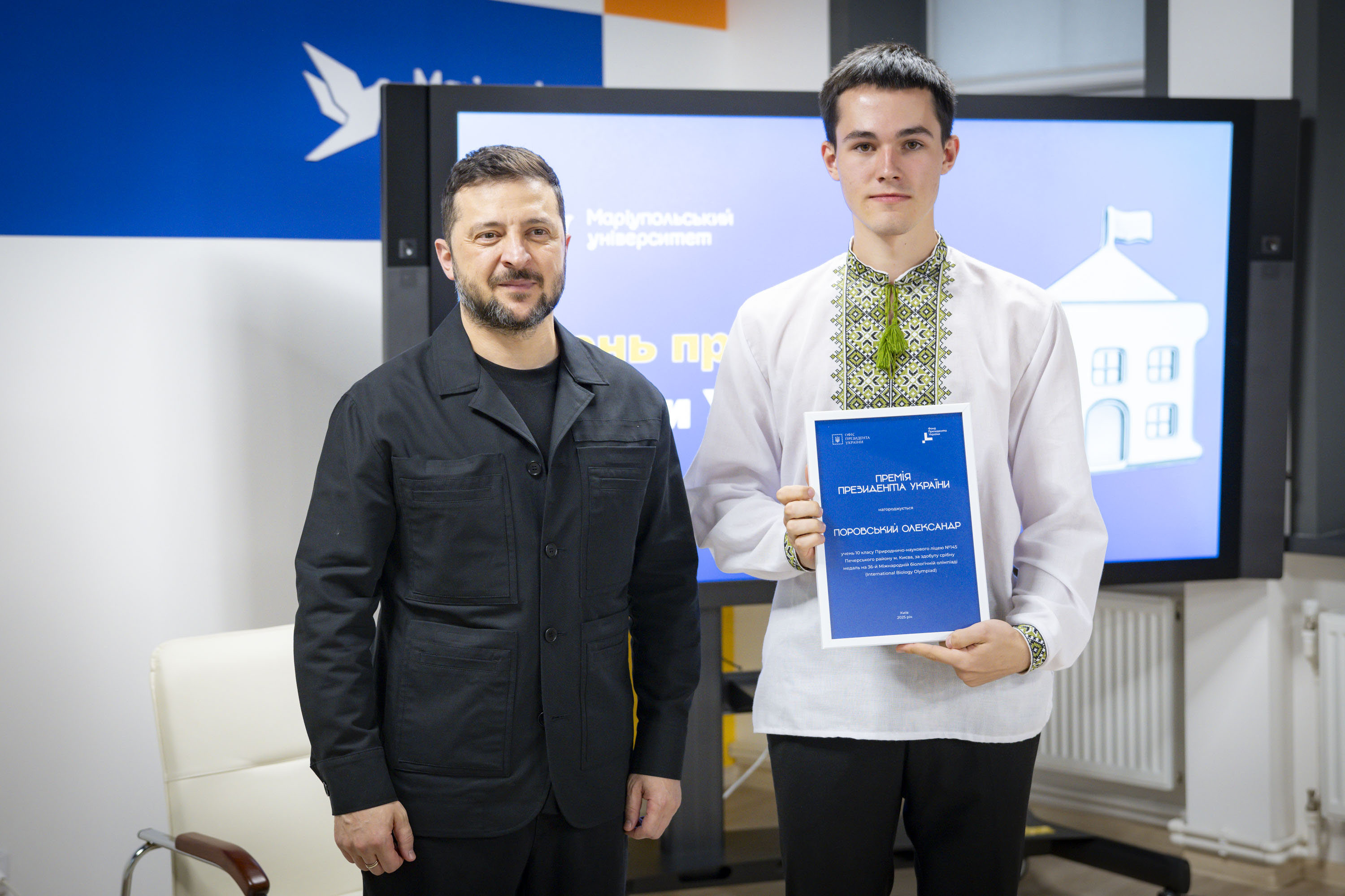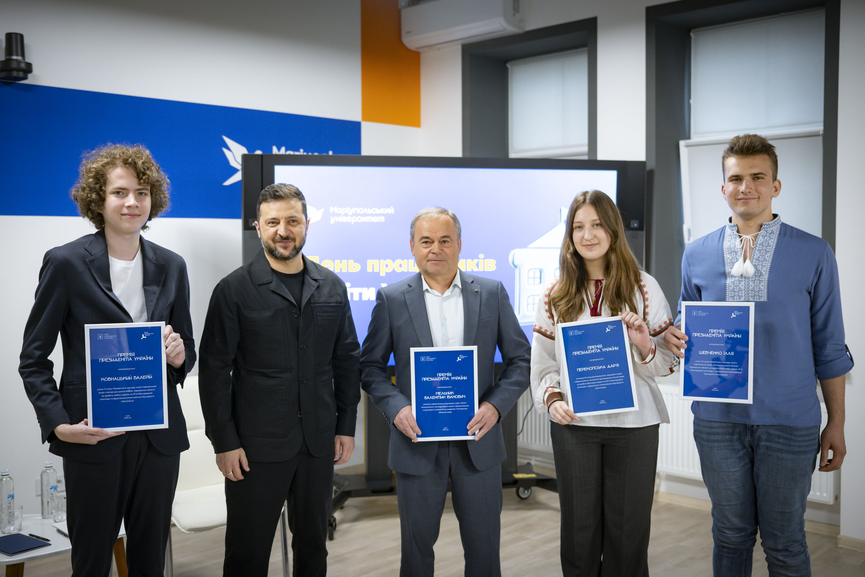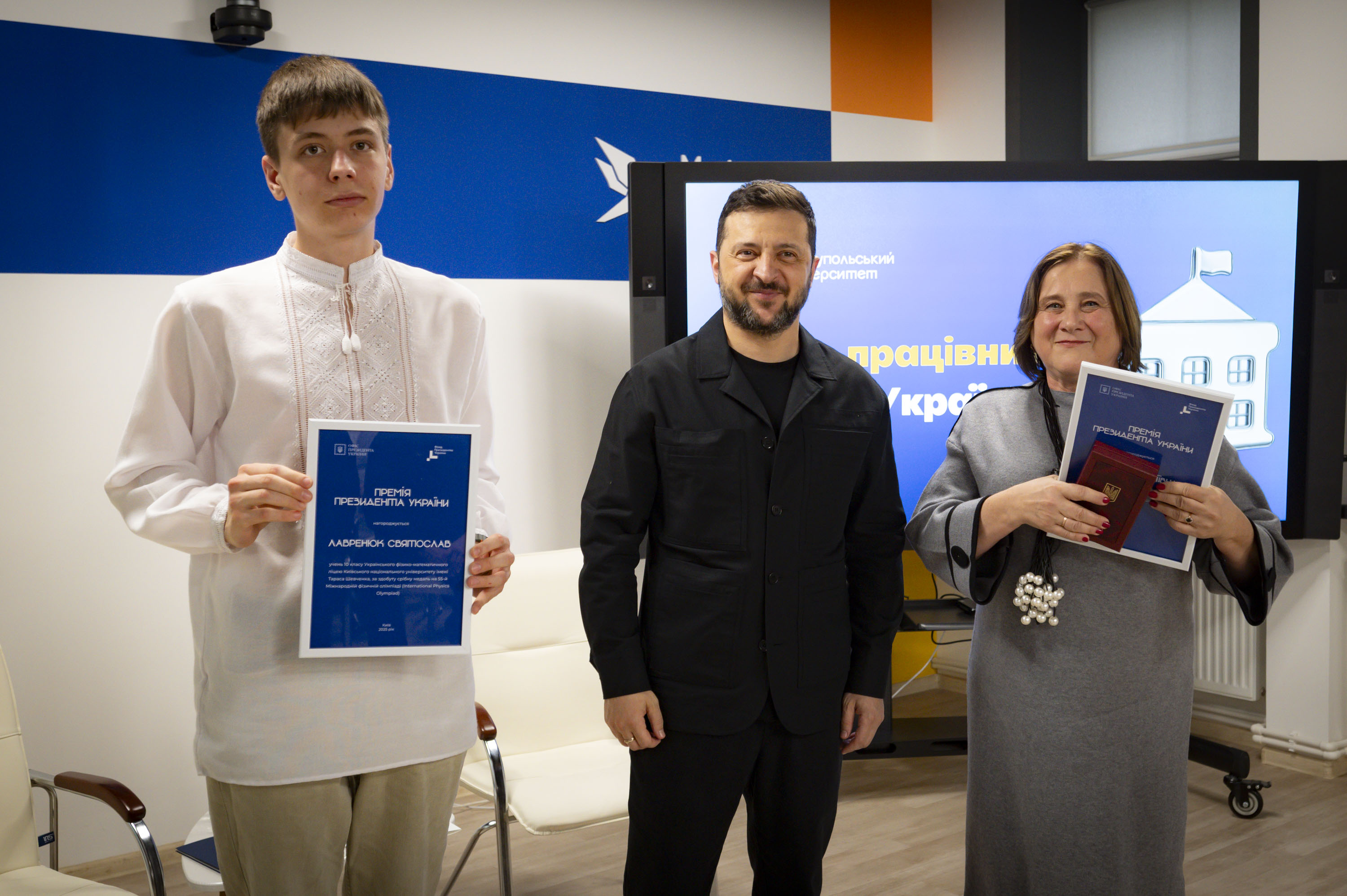 Крім того, Володимир Зеленський вручив переможцям міжнародних учнівських олімпіад та їхнім наставникам сертифікати на отримання премії Президента. Цього року українські школярі здобули 27 нагород: 4 золоті, 12 срібних та 11 бронзових медалей.