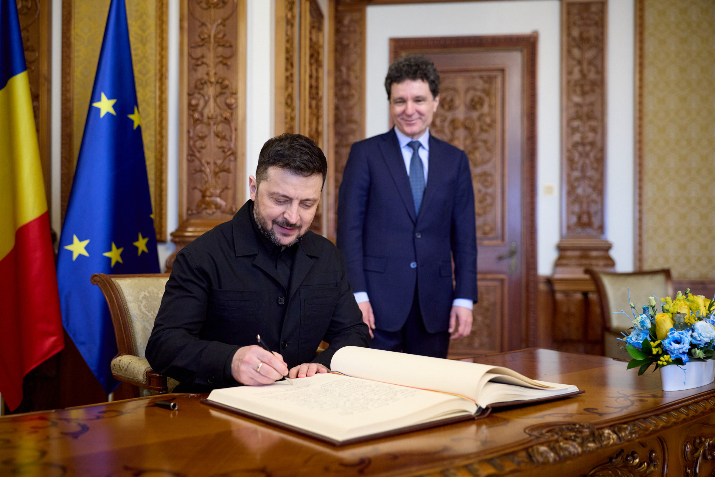 І, звісно, Україна цінує ту увагу й таку повагу Румунії, із якою ви підтримуєте наших людей, і зокрема наших громадян України, які знаходяться тут, у Румунії. Ми говорили про це з паном Президентом, і одним із таких рішень у розвиток нашої гуманітарної та культурної співпраці, у розвиток поваги між нашими народами я підписав указ про встановлення в Україні Дня румунської мови. Щорічно це буде 31 серпня. Вже в Румунії є День української мови – це 9 листопада. Ми говорили й на рівні наших команд, і сьогодні з паном Президентом також про освітні питання – для румунської громади в Україні, для нашої української громади в Румунії. І ми готові справедливо працювати й надалі по всіх цих питаннях. Україна та Румунія – природні стратегічні партнери. Географія нашого регіону, безпекові виклики, економічні потреби наших народів – усе це свідчить про те, що співпраці між нами має бути тільки більше. Я дякую вам іще раз! Дякую, Нікушоре!