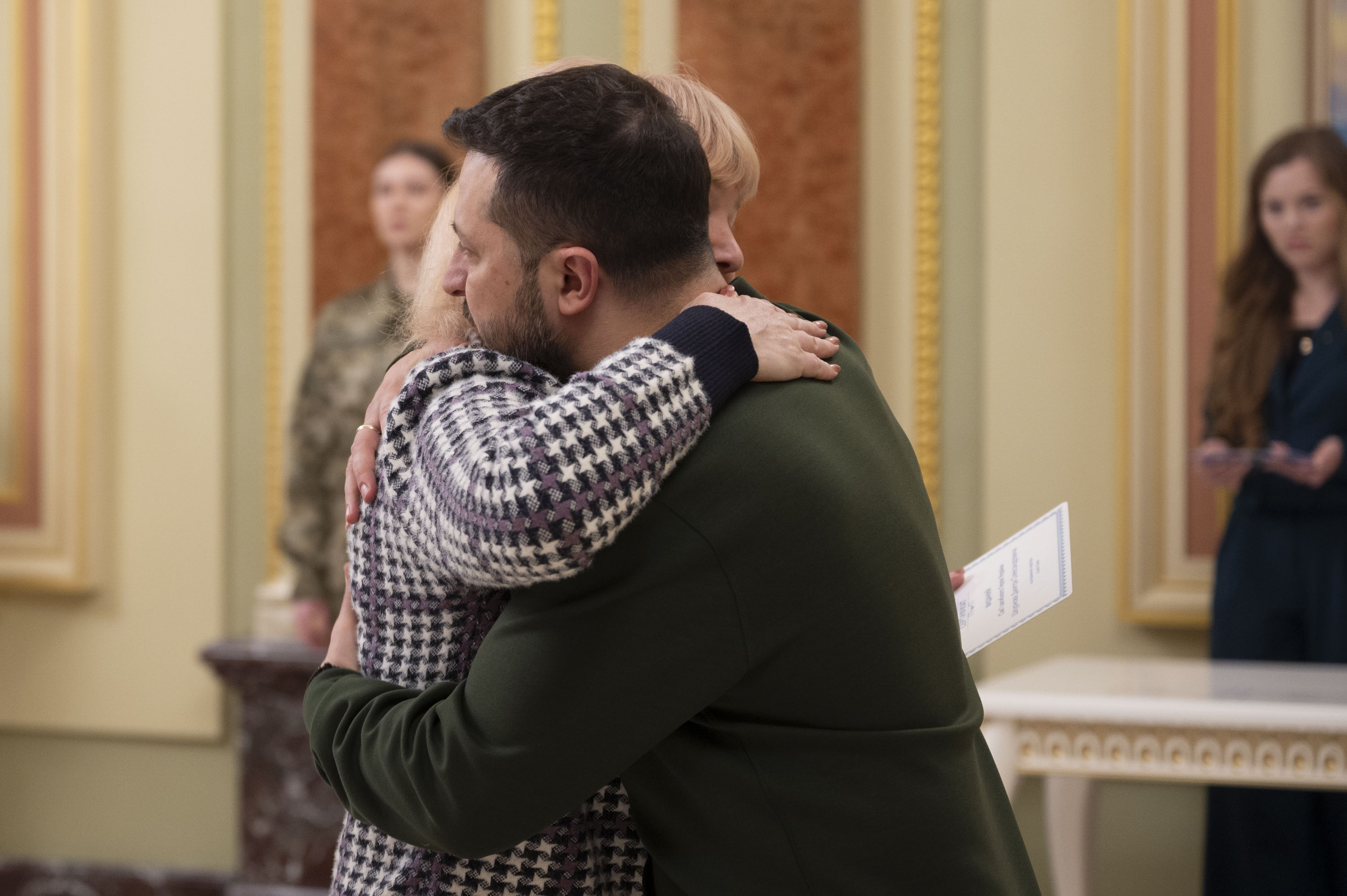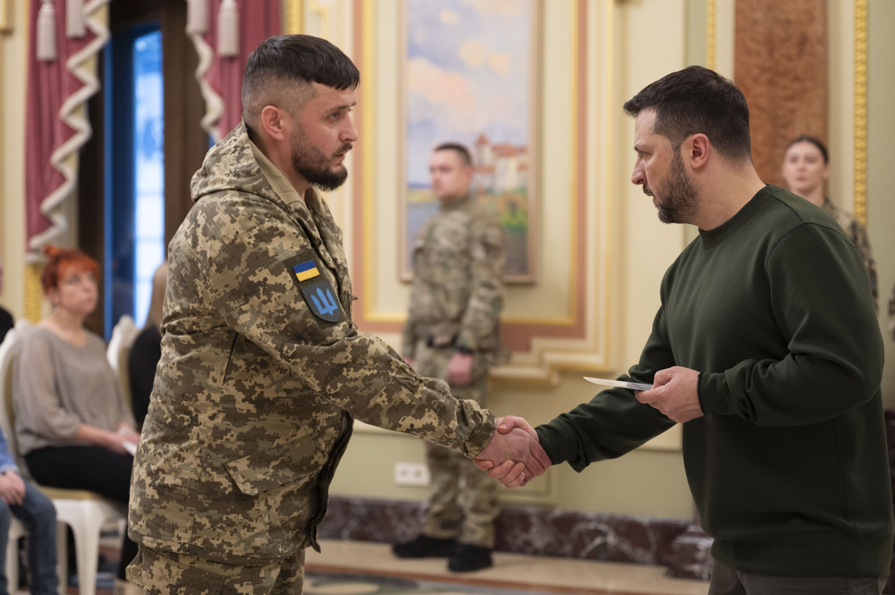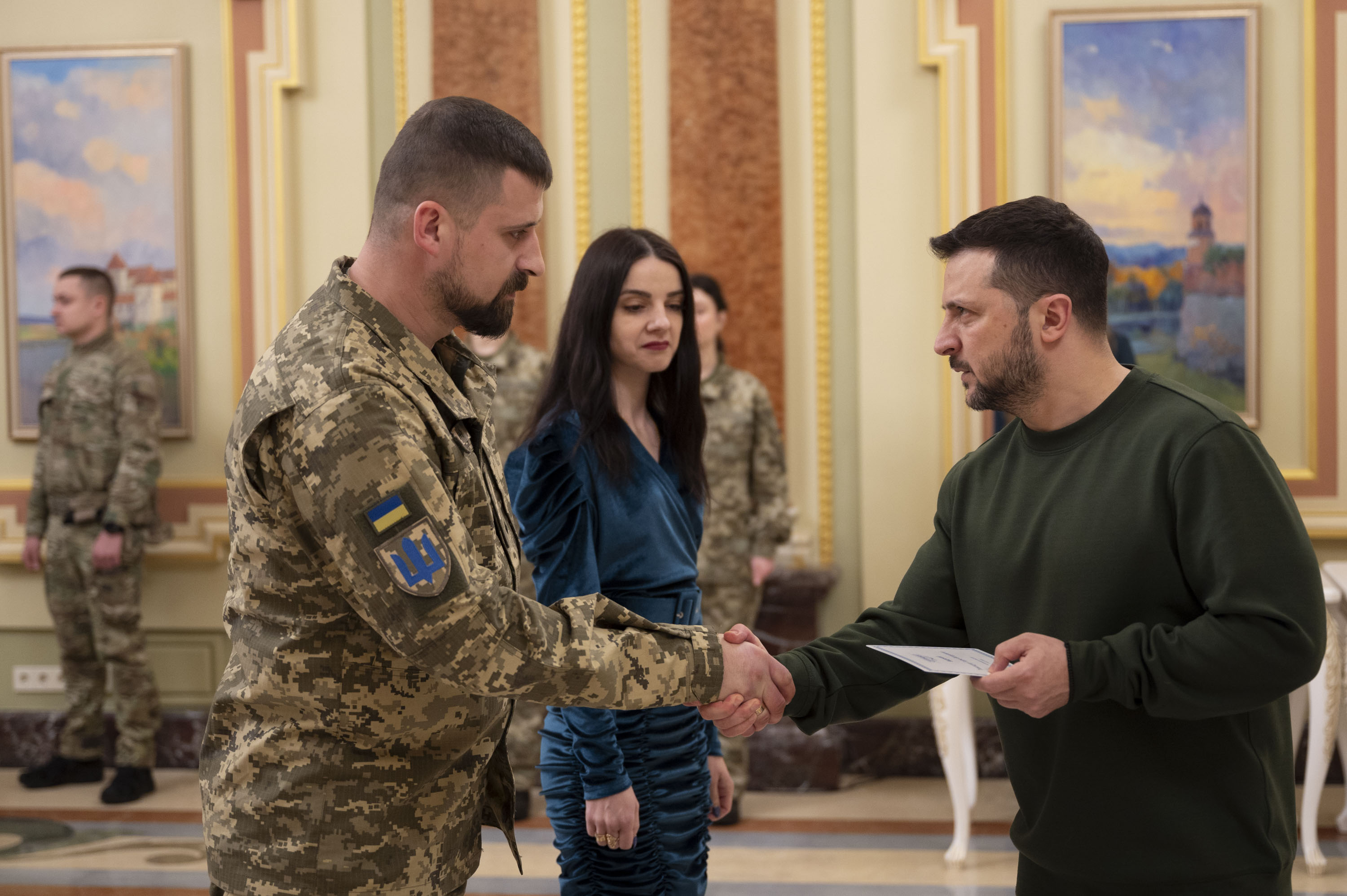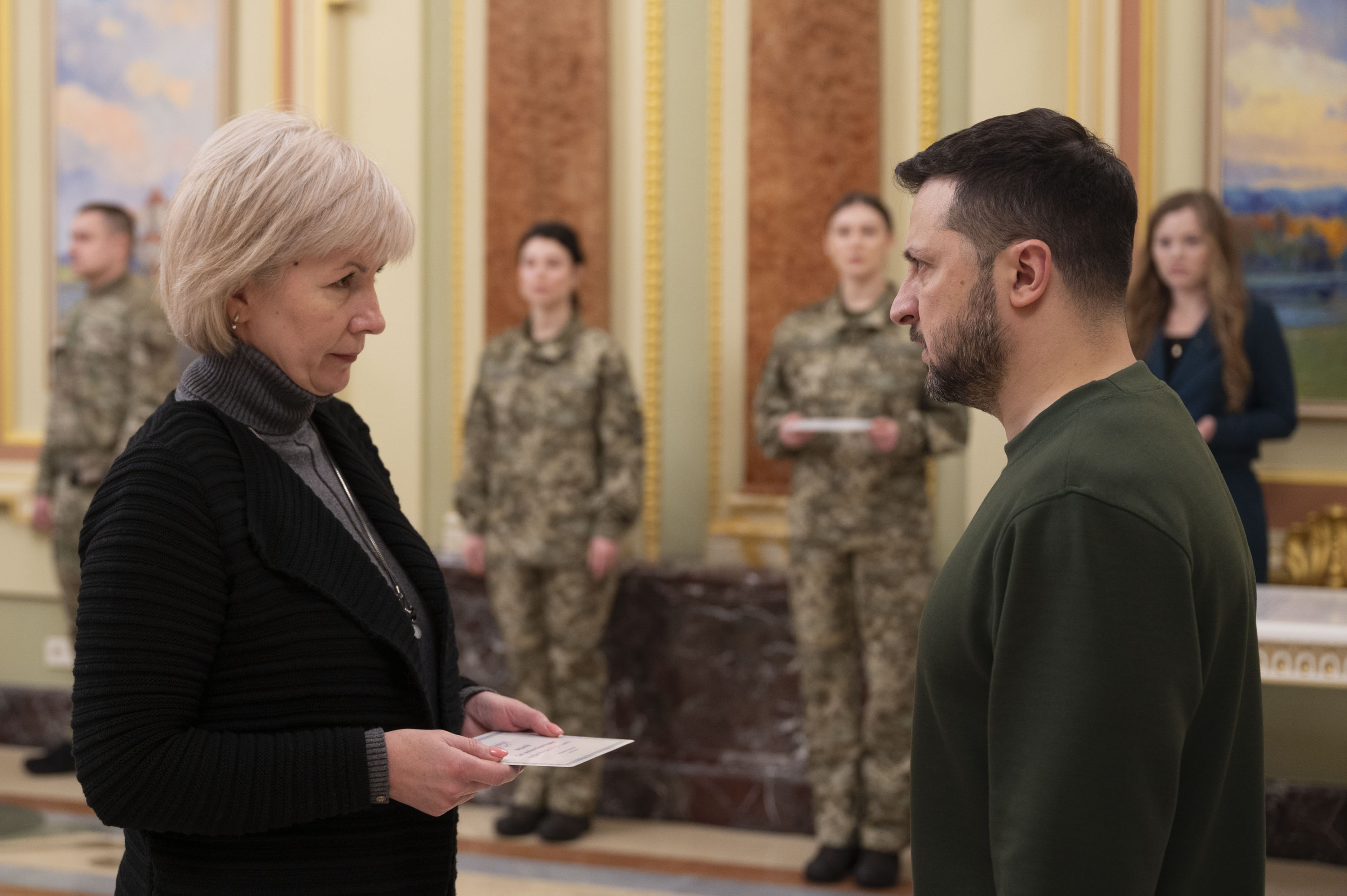 Президент Володимир Зеленський вручив сертифікати на отримання квартир Героям України та членам родин полеглих воїнів, які удостоєні цього звання посмертно, 7 березня 2024 року.