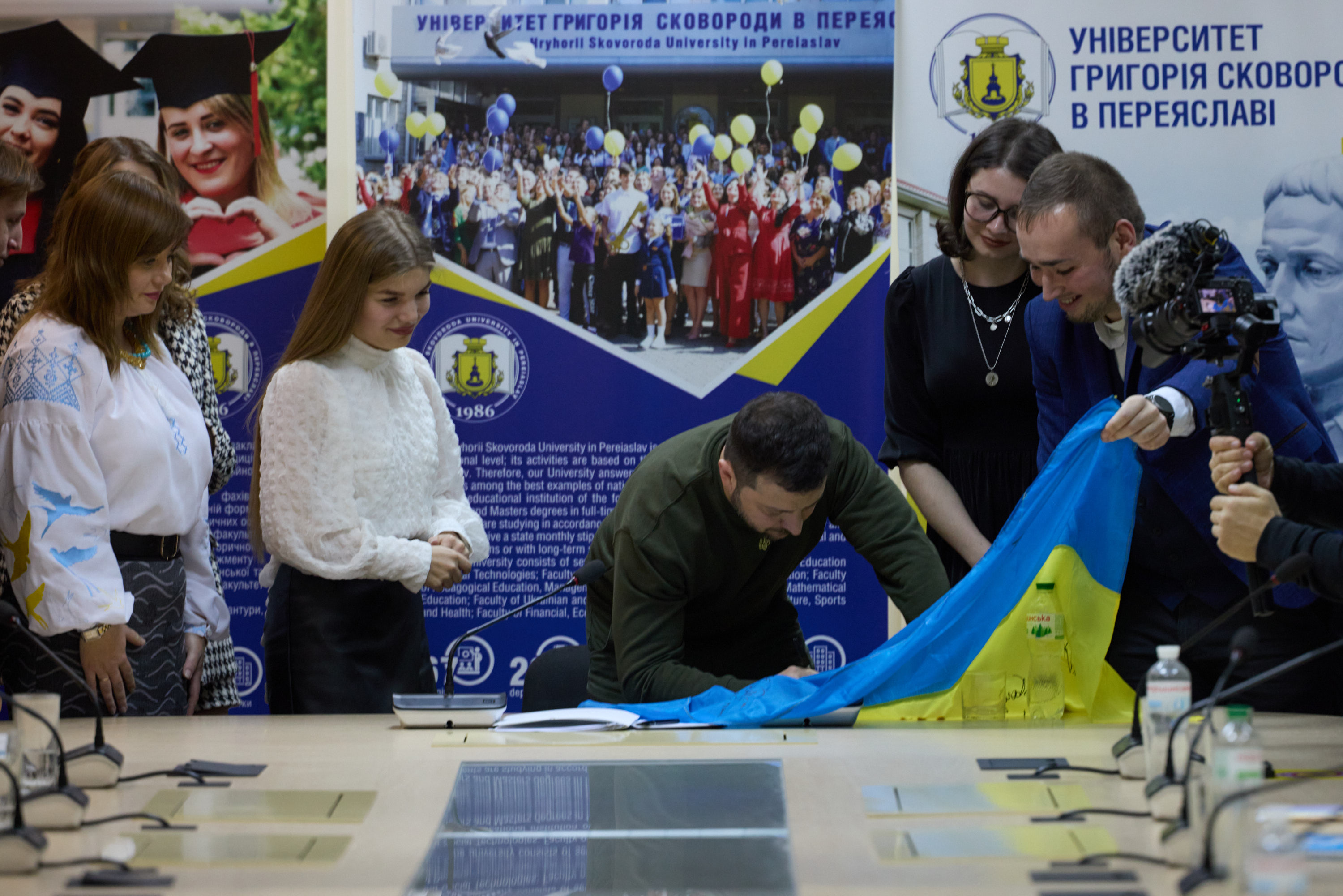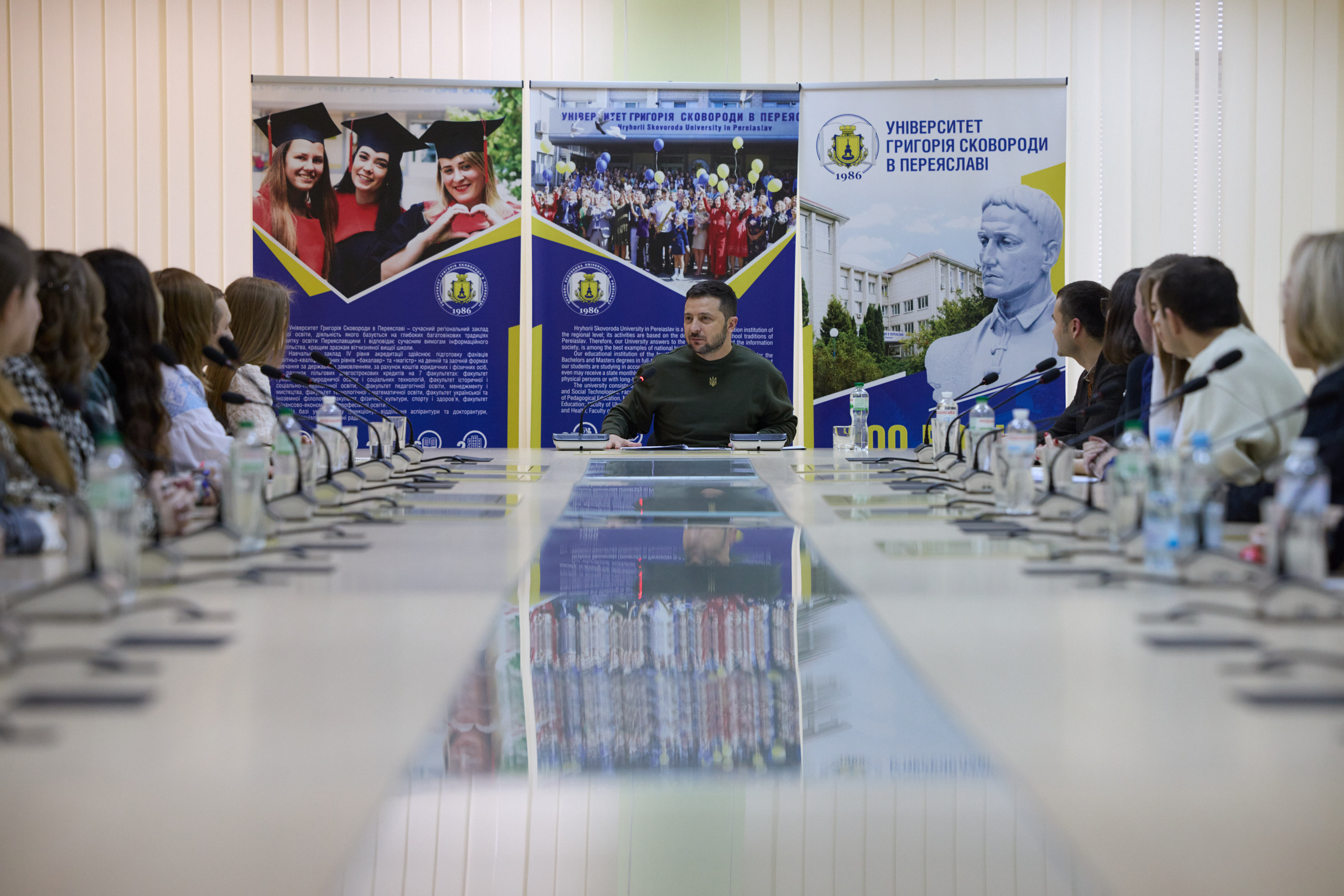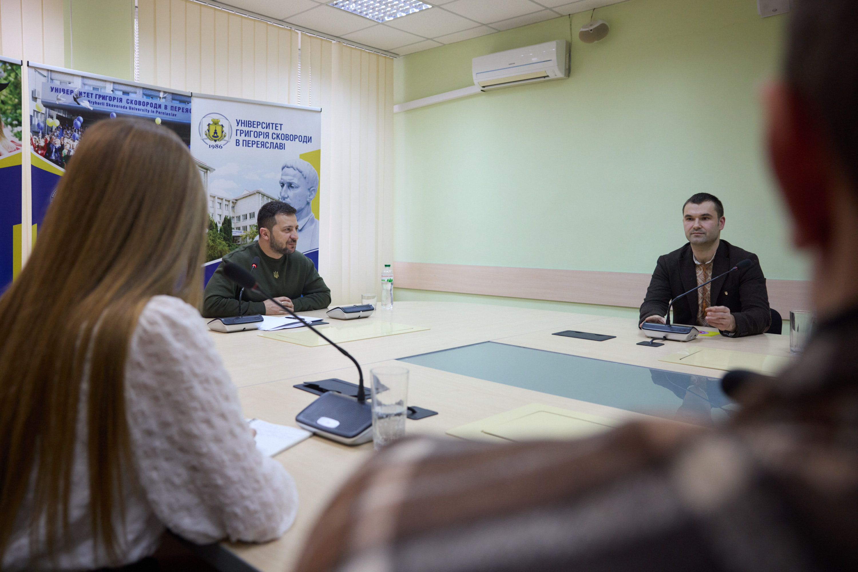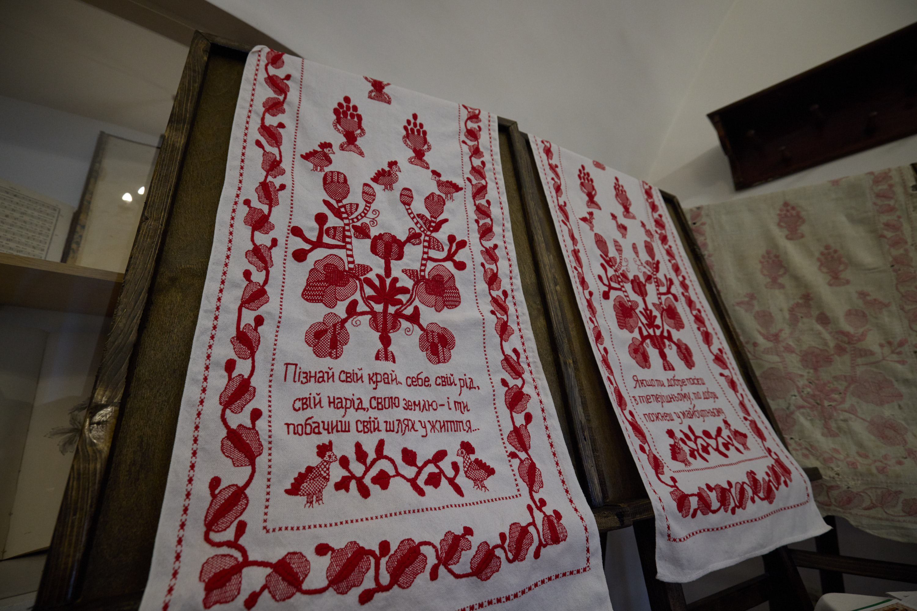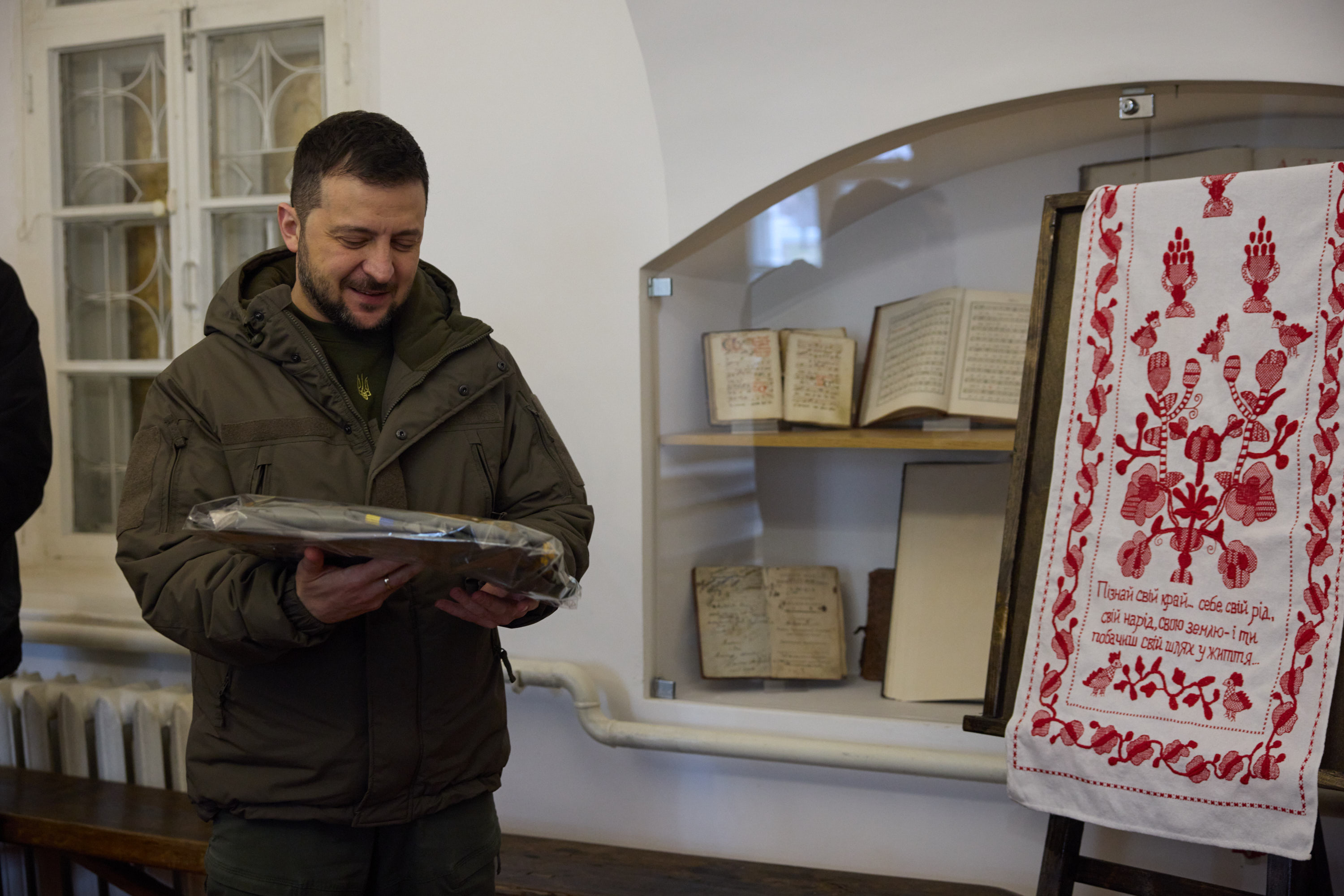 Главі держави розповіли про культурно-мистецький проект «Зі Сковородою в серці», який стартував у травні 2021 року. У його межах створюють рушники з автентичними орнаментами, які були властиві періоду, коли в Переяславі жив і працював Григорій Сковорода.